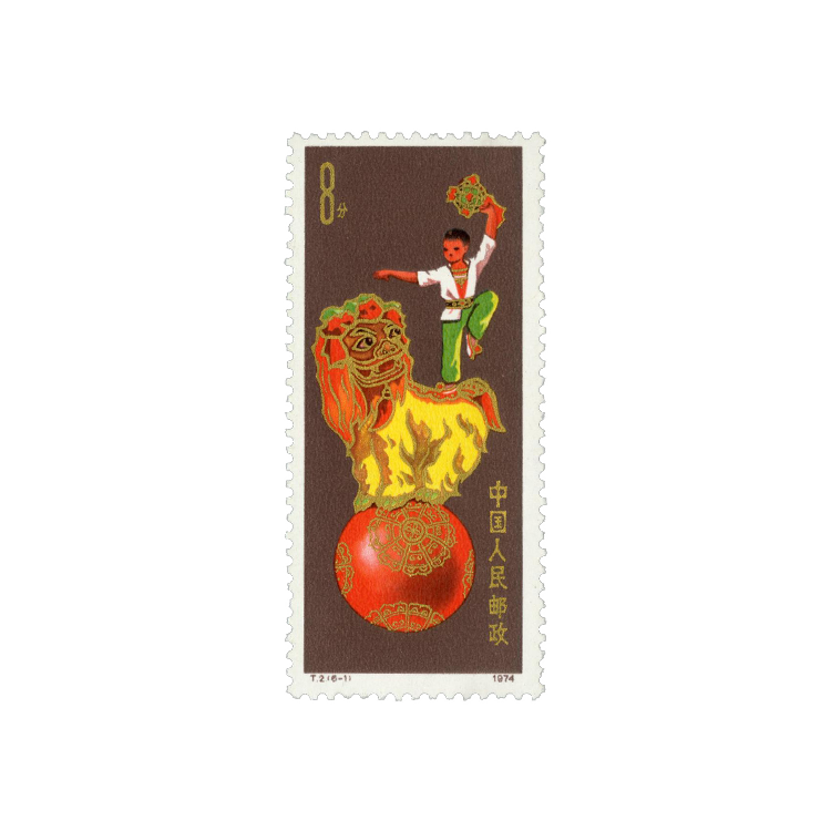 (6-1)舞狮:暗红的背景上,一只金色雄狮立于大红绣球之上,而逗引狮子的演员则更立于狮背之上。形成步步登高高的惊险造型。这是中国杂技最原始基本的保留节目,代表着民族文化的特征。