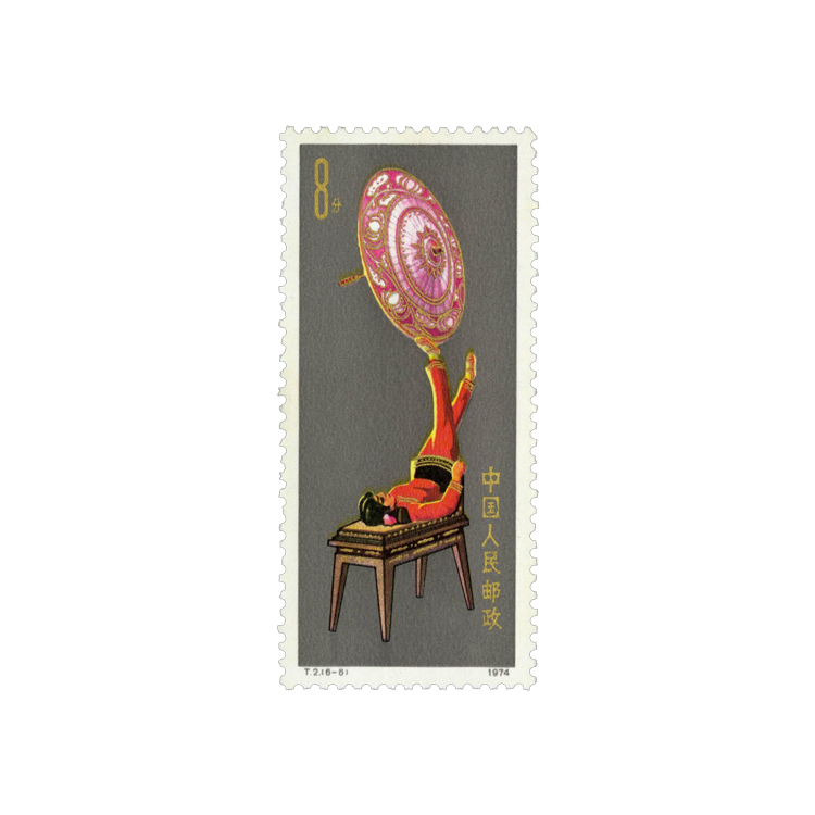 (6-5)转碟:画面上一位女演员正在旋转飞盘,回首望月,姿态优美从容。是中国杂技的传统节目之一。表演时,演员们用一根长约一米,粗如铅笔的竿子顶着碟底,晃动旋转,看上去似迎风而立的荷叶,又若飞舞的彩蝶,优美而抒情。