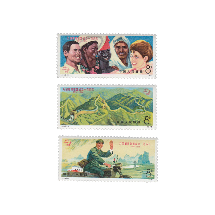 1874年9月15日在瑞士伯尔尼召开会议,有欧、亚、美、非四个洲22个国家的33位代表参加,历时24天,并于10月9日签署了第一个国际性的邮政公约(即伯尔尼公约),公约于1875年7月1日生效。同时,成立了“邮政总联盟”,总部设在伯尔尼。1878年5月,经补充、修订、公约改称为“万国邮政公约”,联盟名称也改为“万国邮政联盟”,成为最早的世界性的组织之一。值此“万国邮政联盟”成立100周年之际,我国邮电部发行的这套纪念邮票,三幅图案上均绘有万国邮联的徽志,以示其独特的纪念意义。
