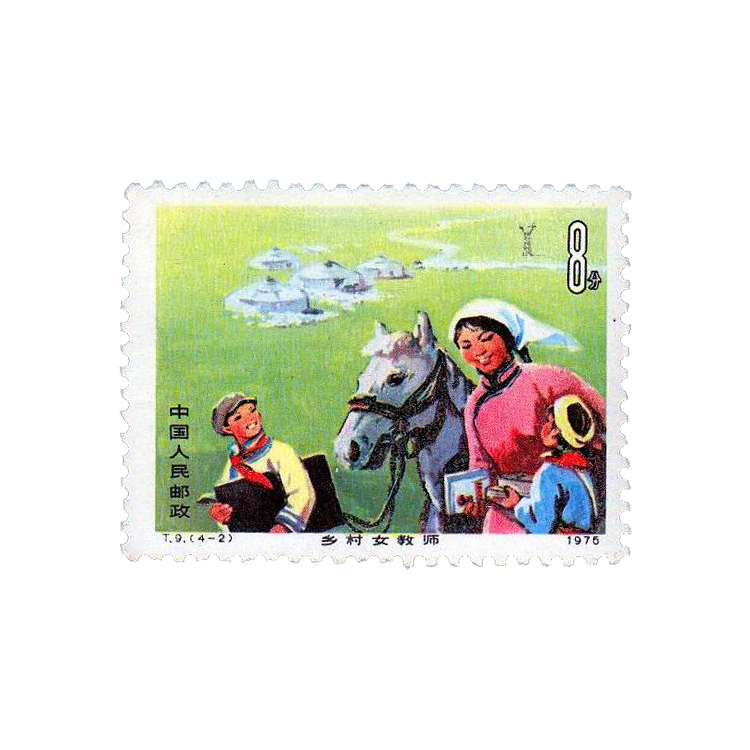 第二枚刻画的是一名身着民族服装的草原女教师,两名兴高采烈的“红领巾”牵着老师的白马,远处是一望无际的大草原和蒙古包,具有浓厚的民族特色,充满了诗情画意。显然这幅票所表现的是一所当时非常流行的“马背小学”;