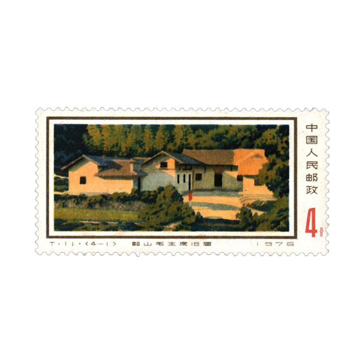 邮票图案描绘了毛泽东同志韶山故居的早晨景色,朝霞染红了茂密的丛林,染红了这座普普通通的农家房舍,创造出了一种“东方红,太阳升,中国出了一个毛泽东”的意境。