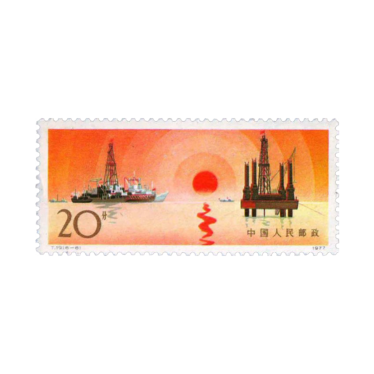(6-6)海上钻探。中国自1965年探明了胜利油田之后,这预示着中国辽阔的海域蕴藏着丰富的潜力资源。海上石油钻探成为了中国当是新兴的石油工业之一。这枚邮票是以一轮红日缓缓升起,映红了海面,伴着被朝霞温暖的天空把整个画面渲染得很热烈。近处的钻井平台和远处的海上巨轮都沐浴在温暖的朝阳下,预示着中国石油海上钻探工业有着光明的前景。