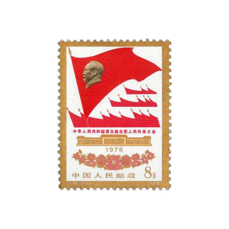 为了庆祝五届人大胜利召开1978年2月26日,中华人民共和国邮电部发行一套“中华人民共和国第五届全国人民代表大会”纪念邮票,编号J24,全套3枚。这套3枚邮票下方,均有人民大会堂的图形及“1978”字样,说明会议召开的地点和时间,并有盛开的牡丹花作衬托,寓意着人民的幸福和富贵吉祥。
