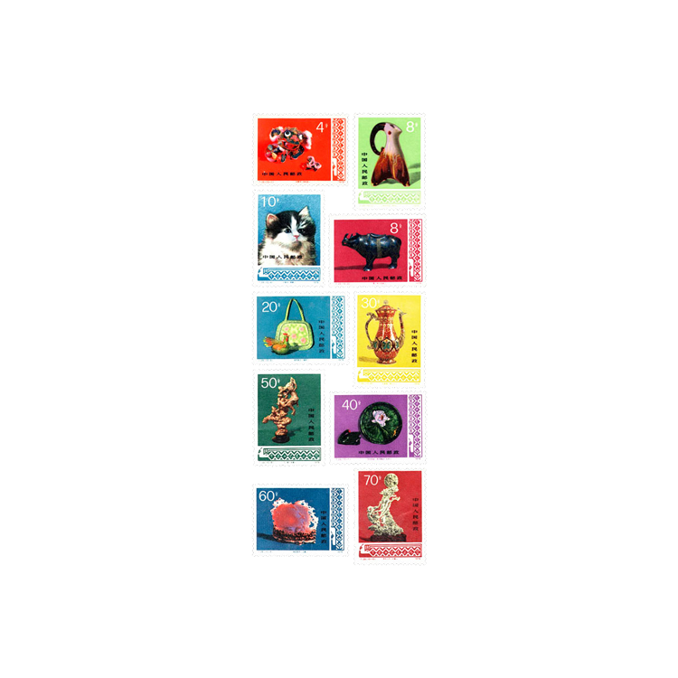 工艺美术是种造型艺术。工艺美术品可分为经过装饰加工的生活实用品即日用工艺品以及有供欣赏的陈设品即陈设艺术品。工艺美术往往因历史时期、地理环境、经济条件、文化传统、技术多,各具异彩,具有鲜明的民族特色。 技术水平、民族风俗及审美观点的不同而具有不同的风格。中国的工艺美木历史久远,品种繁工艺美术取材广泛,从处处可见的一般材丰料如竹、 草、木、布、泥、纸等,到贵或特殊的材料如像牙、玉石、金银等,门类繁多。最主要的有雕刻、编织、织绣、陶瓷、滦器。本套特种邮票选择了10件有代表性的工艺美术品