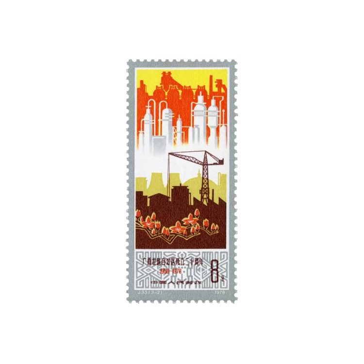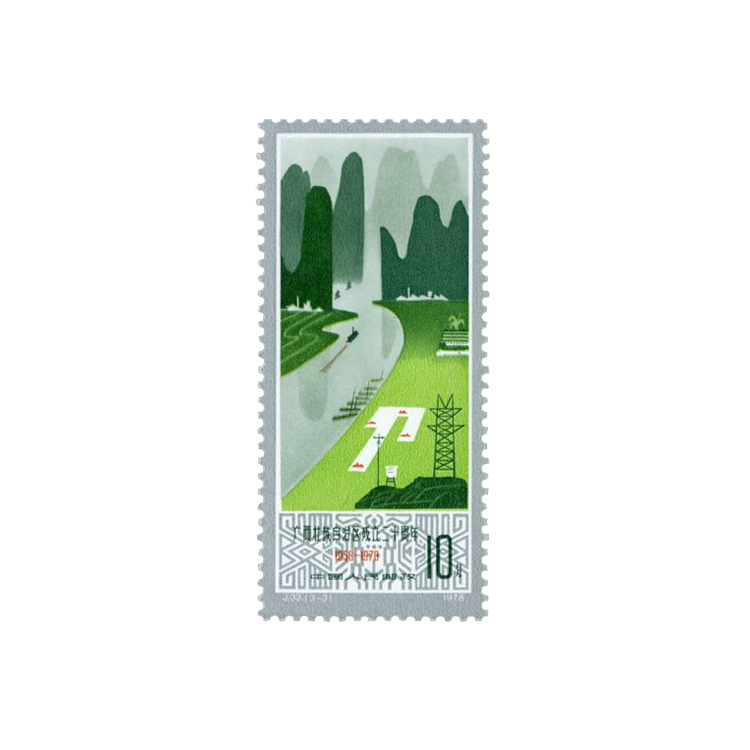 3-3为“农业”。这是一幅以绿色为基调的桂林山水图,但仔细观察,在秀美的山水边,建立起了大型输电线路,同时也有气象观测站。田野是一望无际的绿色。农民们正在辛勤地耕作。河道宽阔,岸边停泊着几条船,表明这里的河运也已打开。这套邮票以生活的画面向我们展示,广西壮族自治区的工农业有着广阔的发展前景。