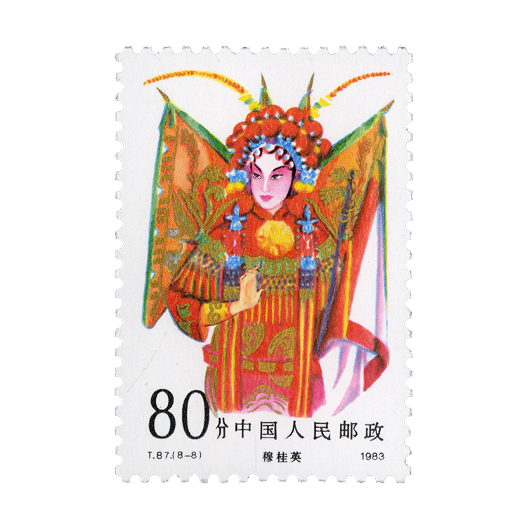 8-8为《穆桂英》中的刀马旦穆桂英。穆桂英是武艺超群的女英雄,剧中反映的是她与宋将杨六郎的儿子杨宗保成亲后,挂帅领兵为宋朝立功的故事。画面为为穆桂英身穿帅服的形象。