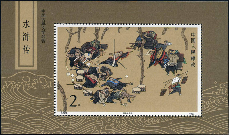 1987年12月20日,为了宣传四大名著之一《水浒传》,邮电部发行了《中国古典文学名著—《水浒传》(第一组)》特种邮票,全套4枚,小型张一张。