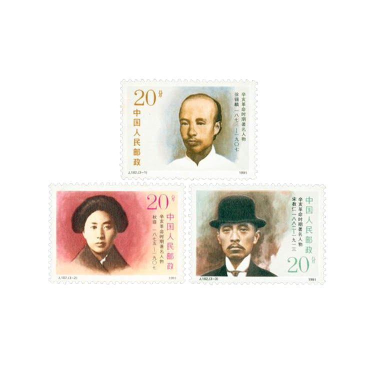 这套纪念邮票是纪念辛亥革命80周年于1991年10月10日发行的,画面依次是为辛亥革命献出生命的著名人物徐锡麟、秋瑾、宋教仁。