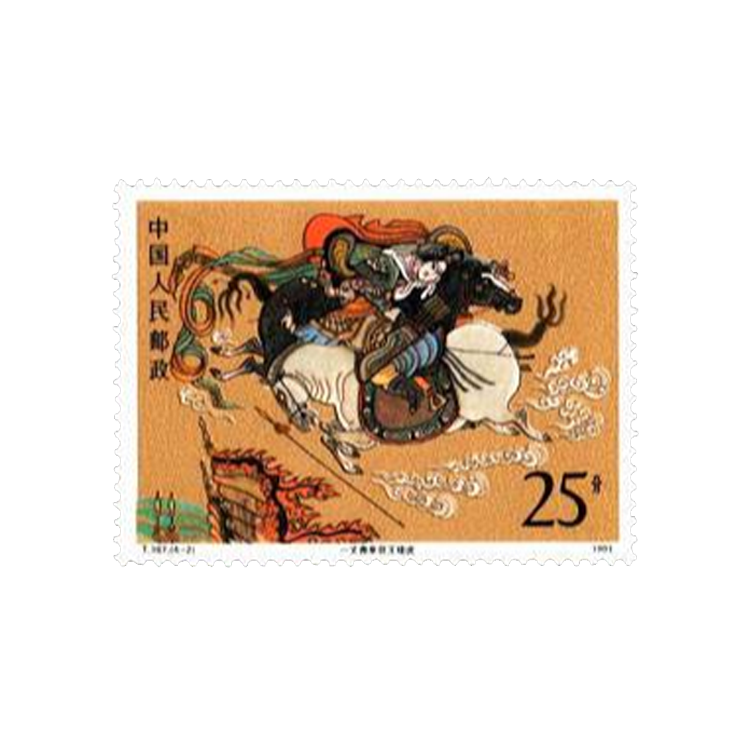第三枚“顾大嫂登州大劫牢”,表现了梁山三位女英雄的其中一位,顾大嫂,画面上把顾大嫂、二解和乐和组织在一起,充分表现嫉恶如仇、见义勇为,为解救无辜者而置个人安危于不顾的顾大嫂的英雄形象。