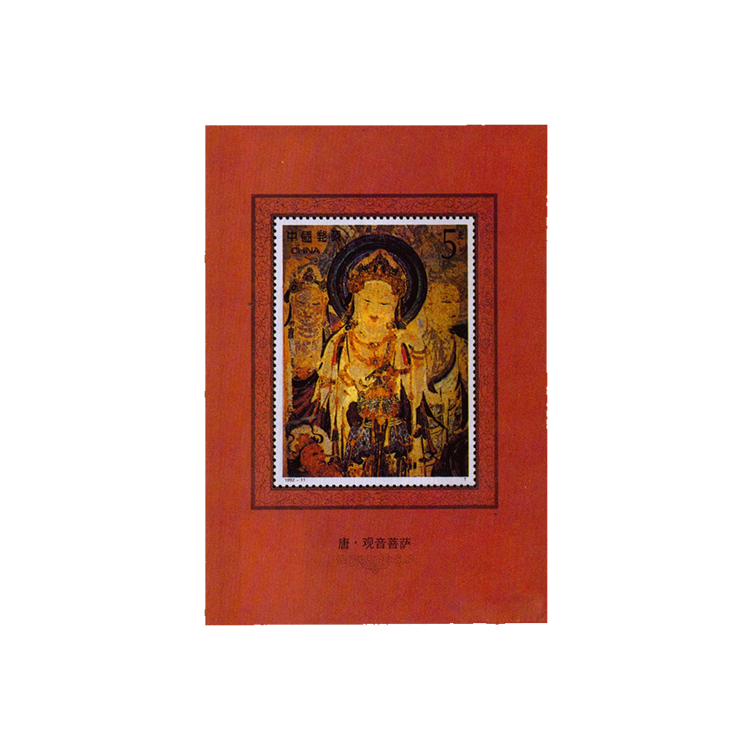 小型张为《唐·观音菩萨》。选用了敦煌莫高窟第57窟面壁《阿弥陀佛说法图》的局部—观音菩萨形象。画中的观音形态优美,两眉弯月,双目低垂,大耳红唇,十分可亲。与早期敦煌壁画中的佛像相比,小型张中的观音与邮票上的菩萨更接近凡人俗子,反映了唐人审美观念的变化和对佛教的新认识。
