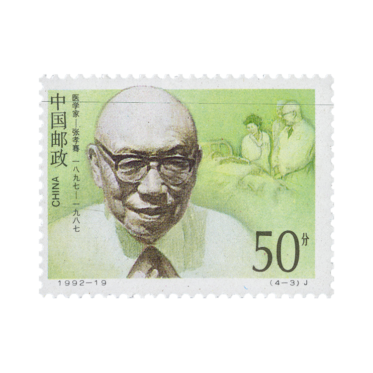 4-3为“医学家张孝骞”。主图为张孝骞头像,画面人物形象慈蔼、亲切。他带领青年医生查房的背景被处理成淡紫色,暗含拯救生命、妙手回春之意。
