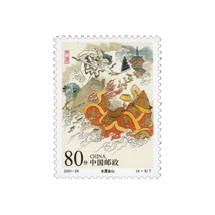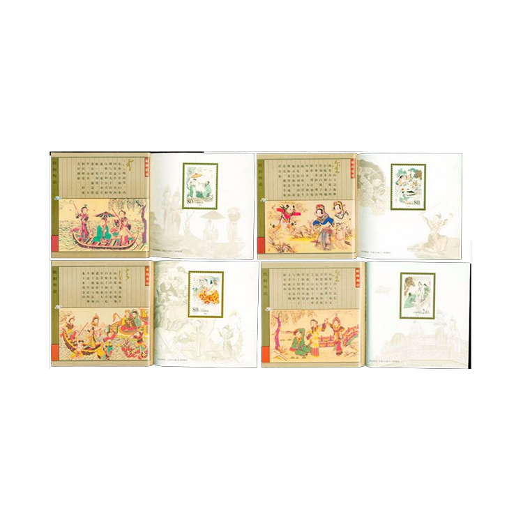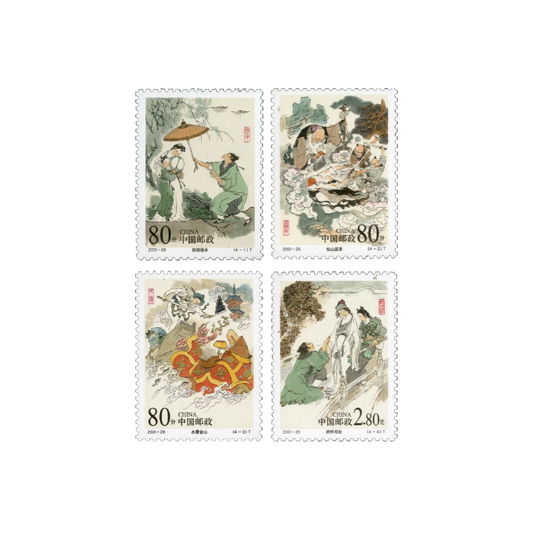 本套邮票采用中国画形式设计,描绘了传说中游湖借伞、仙山盗草、水漫金山、断桥相会的经典情节,并分别用“借伞”、“盗草”、“水漫”、“相会”红色印章点题,讲述了这个优美动人的民间传奇故事。
