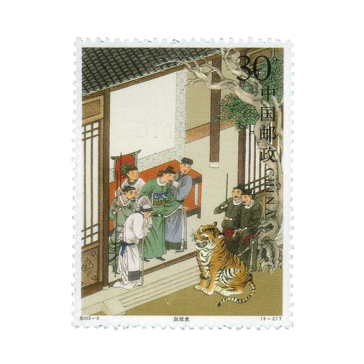 (6-2)为“赵城虎”。《赵城虎》描写了赵城有位70多岁的老太,其独子进山被虎吃掉。老太连哭带号要求县官为她捉虎。差役李能日夜潜伏在山谷里一个多月,仍未捉到,只好前往山神庙祷告。哭声中,有虎步入,承认吃了老太的儿子,俯首贴耳地让他绑去。县官要求虎当老太的儿子,帮她维持生活。从此,虎有时送来死鹿,有时衔来钱财。老太从此富裕起来,人畜相安。老太死后,虎还来灵堂前示哀。