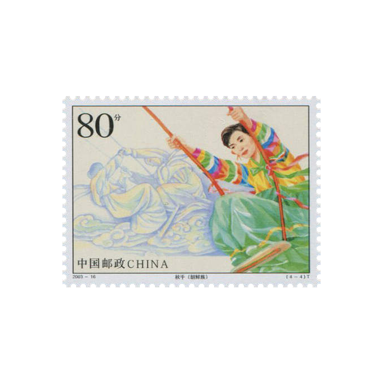 (4-4)为“朝鲜族.秋千”。主要为朝鲜族妇女传统体育项目。每逢节日或庆祝丰收,尤其是端午节,朝鲜族妇女都身着盛装,争相荡秋千。有的是以秋千架高树上的树叶或花朵为目标,用脚碰到或是咬掉树叶(花朵)者为胜;有的是秋千架前方竖两根木杆,再把一条系有铃铛的绳子栓在两杆之间,以碰铃次数多少定胜负;还有的在秋千踏板底下栓一根长绳,测量秋千荡起高度等等。那五颜六色的艳丽衣裙配着翩舞的绸带在空中飘扬,不仅衬托出朝族妇女的优美和典雅,也表现了她们的勇敢和坚毅。