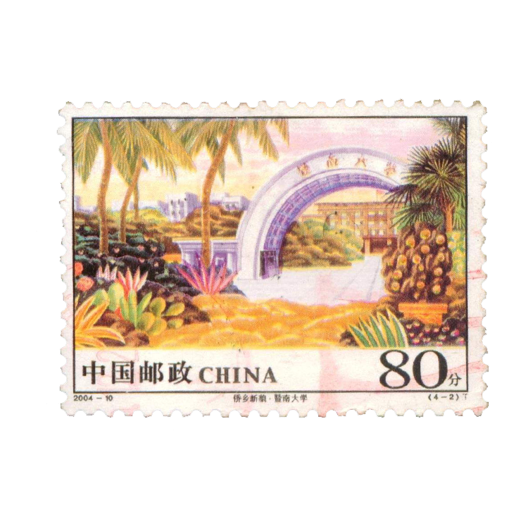 (4-2)为“暨南大学”。画面描绘了暨南大学的拱形大门和热带风光的校园。展现了侨乡的教育环境面貌。暨南大学位于广州黄埔大道,为第一所国家创办的华侨学府。“暨南”意即面向南洋。其前身为1906年创办于南京的暨南学堂,1927年更名为国立暨南大学;抗日战争期间,迁址福建建阳;1946年迁入上海;1949年9月合并入复旦大学、上海交通大学等,1958年在广州重建,1994年改建。现有16个学院,37个系,在广州、深圳、珠海三地设有四个校区,在校全日制学生19659人,其中华侨、港澳台学生7484人。