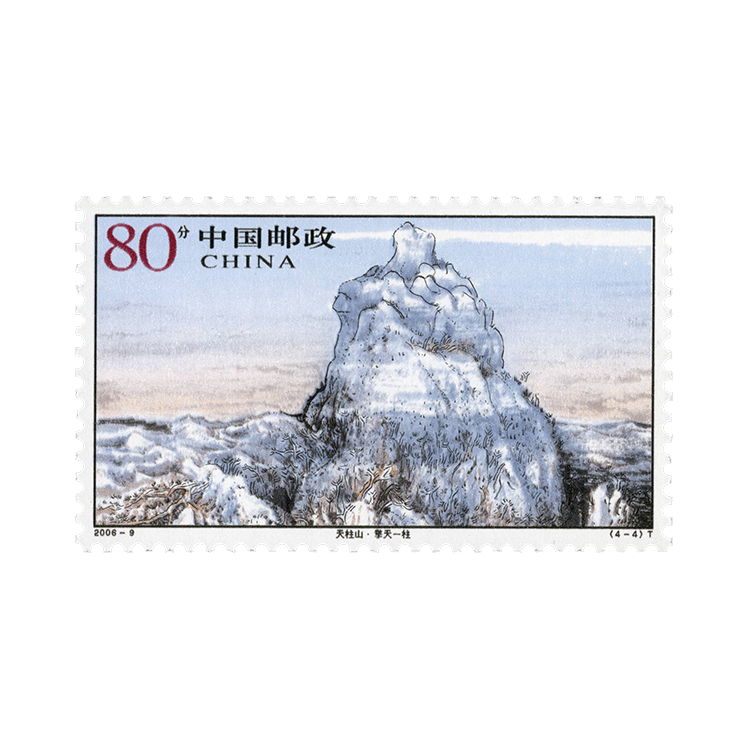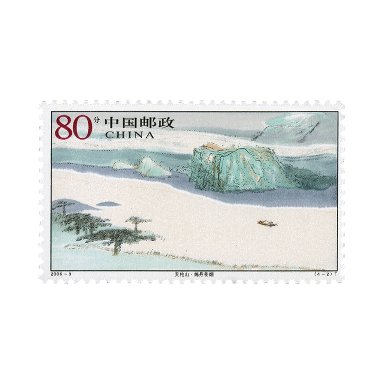 这套邮票编号为2006-9T,全套四枚,图案主题分别为青龙探海(面值60分)、炼丹苍烟(面值80分)、三祖禅林(面值80分)、擎天一柱(面值80分),既有表现天柱山的自然风光,又有展示天柱山的人文景观,它是一套地道的安庆题材邮票。