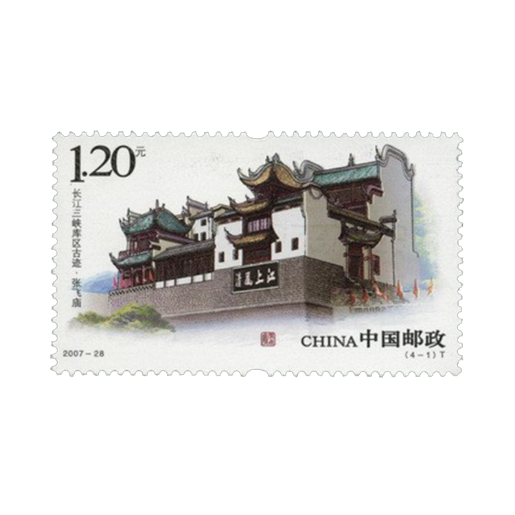 国家邮政局定于2007年10月13日发行《长江三峡库区古迹》特种邮票1套4枚。这套特种邮票图名分别为:张飞庙、石宝寨、大昌古镇、屈原墓。面值均为1.20元。