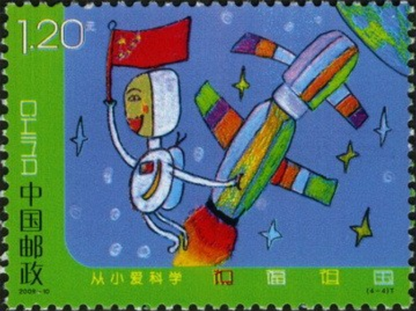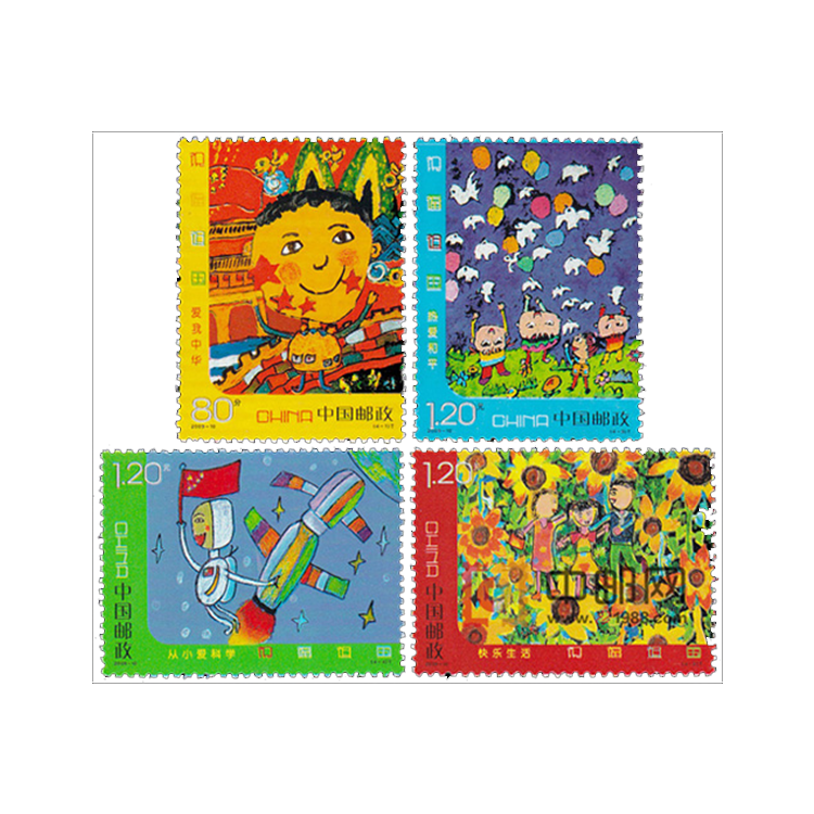 为了纪念中华人民共和国建国60周年,反映60年来我们的国家、民族和社会的巨大变化以及取得的辉煌成就,表达广大少年儿童对祖国的深情和热爱,邮票发行部门与中国美协儿童美术艺术委员会联合在全国开展了“祝福祖国”邮票的儿童画征稿活动。最终以来自“儿童画之乡”江苏的4幅儿童画作品被选为邮票团。儿童画笔法稚拙可爱,设色艳丽大胆,想想丰富,感情真挚。