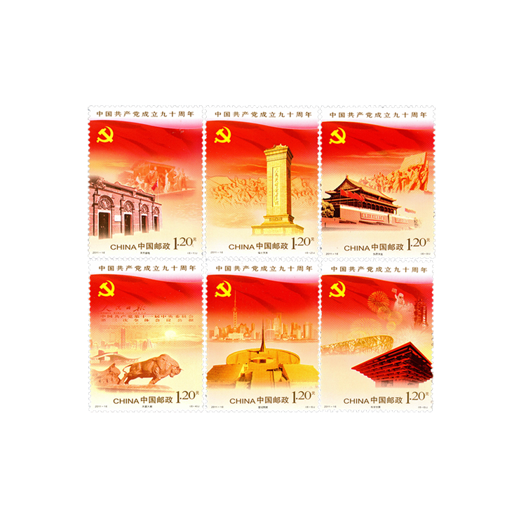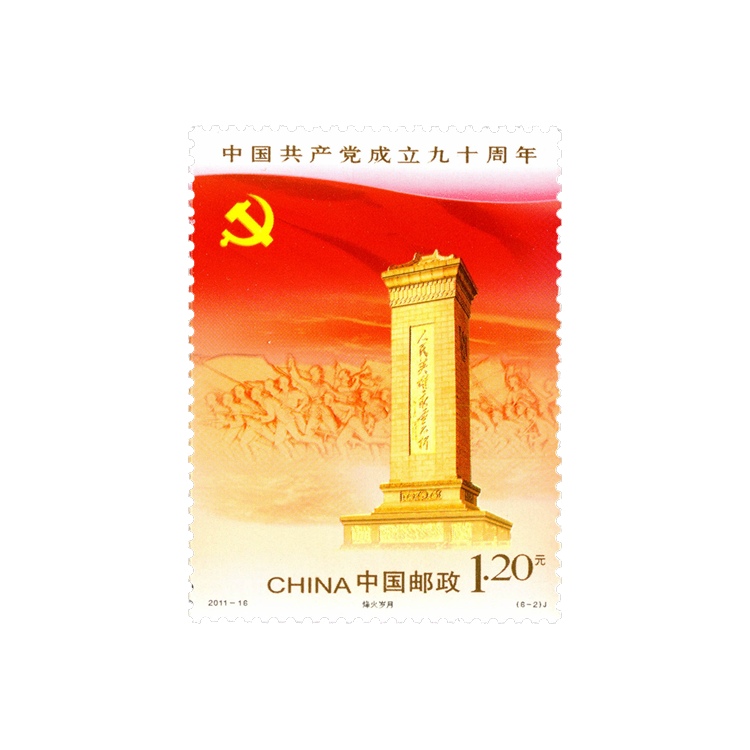 • 中国邮政2011年6月22日发行《中国共产党成立九十周年》纪念邮票,1套6枚,小型张1枚。