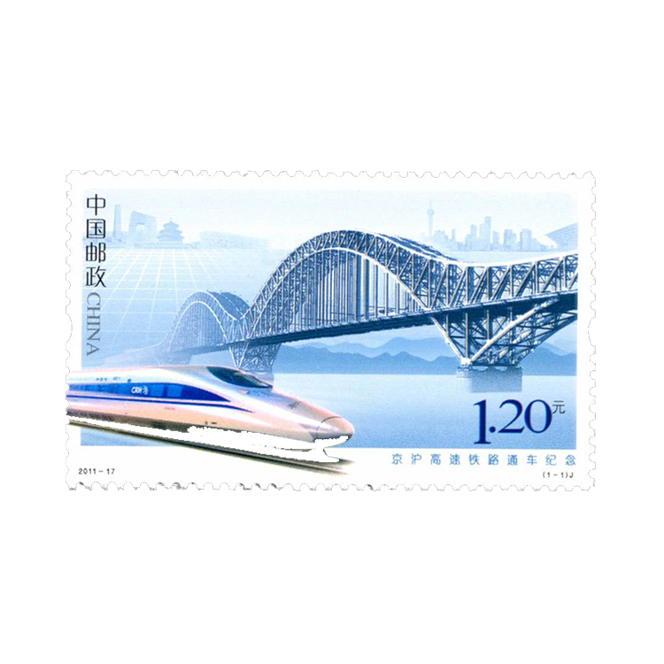 京沪高速铁路全长1318公里,是世界上一次建成里程最长、技术标准最高的高速铁路。自6月24日9时起,开始对外发售京沪高铁车票,并定于6月30日下午3点通车运营。为此,中国邮政于6月30日发行2011-17 《京沪高速铁路通车纪念》纪念邮票1套1枚,面值为1.20元。邮票主图为疾驰而来的和谐号列车和京沪高铁的控制性工程南京大胜关长江大桥,在左、右上角分别为天坛祈年殿、国家体育场、东方明珠电视塔、世博园中国馆等京沪两地的标志性建筑。