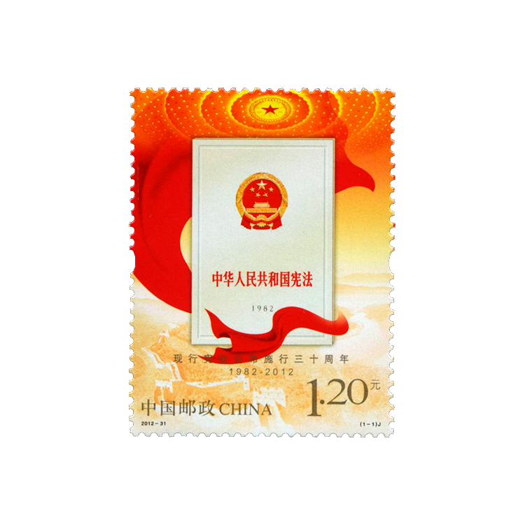 中国邮政定于2012年12月4日发行《现行宪法公布施行三十周年》纪念邮票1套1枚。