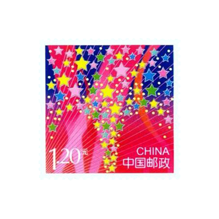 《流光溢彩》邮票图案为五颜六色冲天燃放的五角星组成的烟花及交织的多彩光柱组成,背景上半部分为象征夜空的深蓝色,下半部分为寓意喜庆吉利的红色,由邮票设计师岳昕设计。