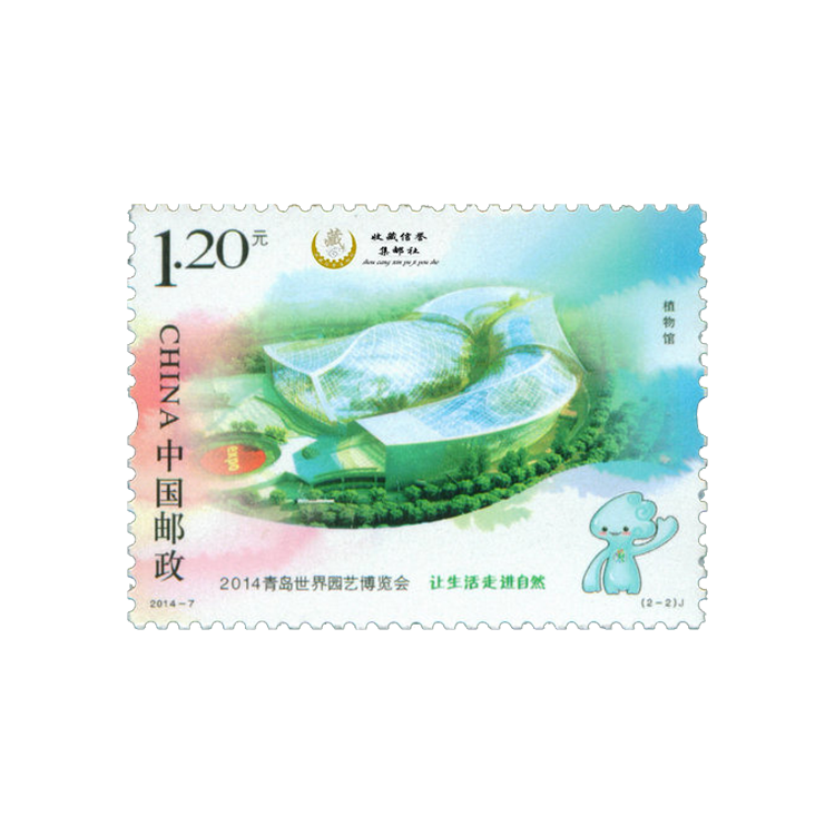 该套邮票设计将主题馆和植物馆置于邮票画面中心,背景以渐变的泼彩写意,将建筑融入画面,用写意的手法,将园林艺术与人文生活结合起来,生动诠释了2014青岛世界园艺博览会“让生活走进自然”的主题以及世园会的地域特征。该套邮票由蒋蔚设计,北京邮票厂影写版印制。