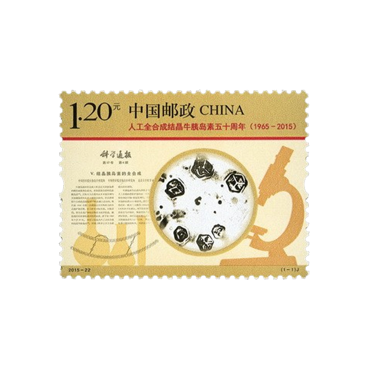 中国邮政定于2015年9月17日发行《人工全合成结晶牛胰岛素五十周年》纪念邮票1套1枚。