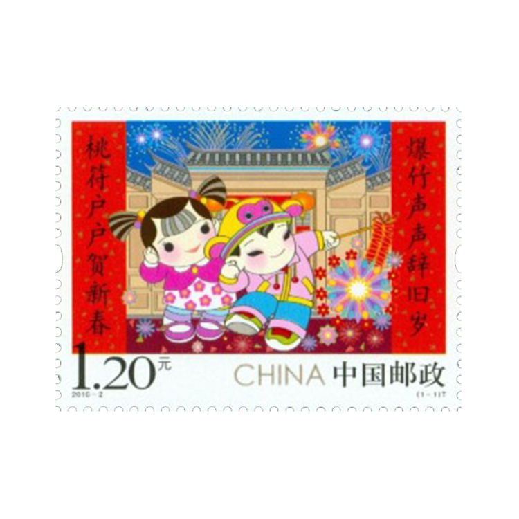 该套邮票延续了2015年《拜年》邮票的风格,年味突出。画面中,“欢欢”戴着“猴帽”双手高举竹竿,挂着火红的正在燃放的鞭炮,炮花如绽放的春之花,绚丽多彩;“喜喜”双手捂耳,一脸喜悦,笑逐颜开。两侧吉祥寓意的对联:“爆竹声声辞旧岁 桃符户户贺新春”,烘托出喜庆祥和的新年气氛。