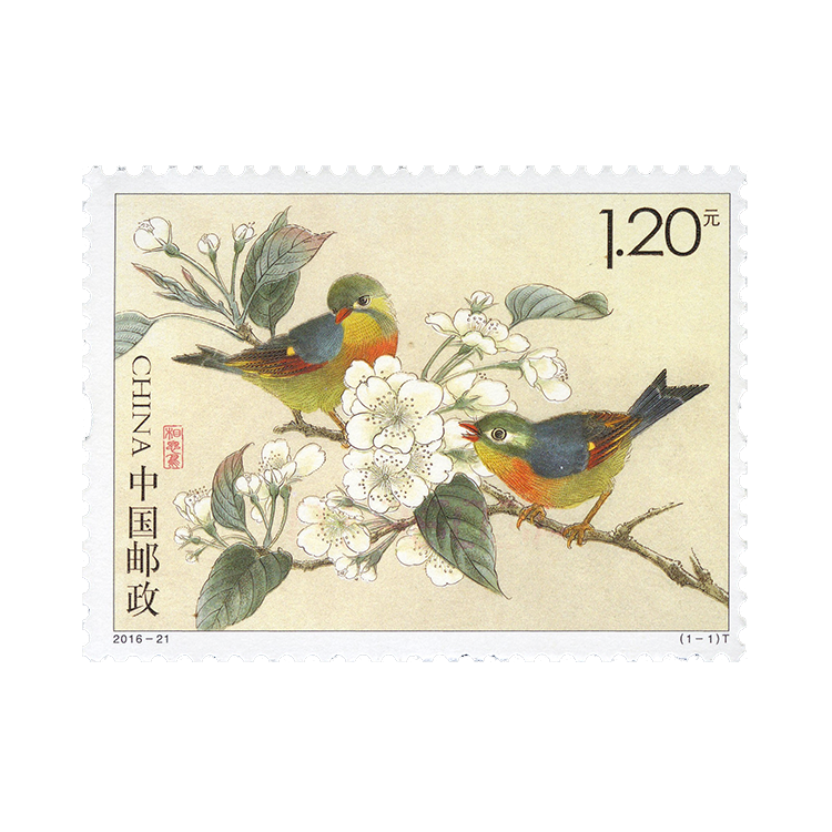 邮票画面采用中国画工笔重彩的表现形式,一对相思鸟在梨花间,暗含“成双成对 不离不弃”之意。