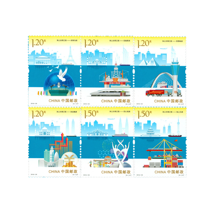 邮票设计将海上丝绸之路沿线地区的知名历史古迹、现代地标式建筑与城市建筑群相结合,穿梭的各类船舶与飞机表达了海上丝绸之路沿线国家紧密、繁忙的交往状态。邮票设计表现了海上丝绸之路绵延不绝的悠久历史和欣欣向荣的时代风貌。