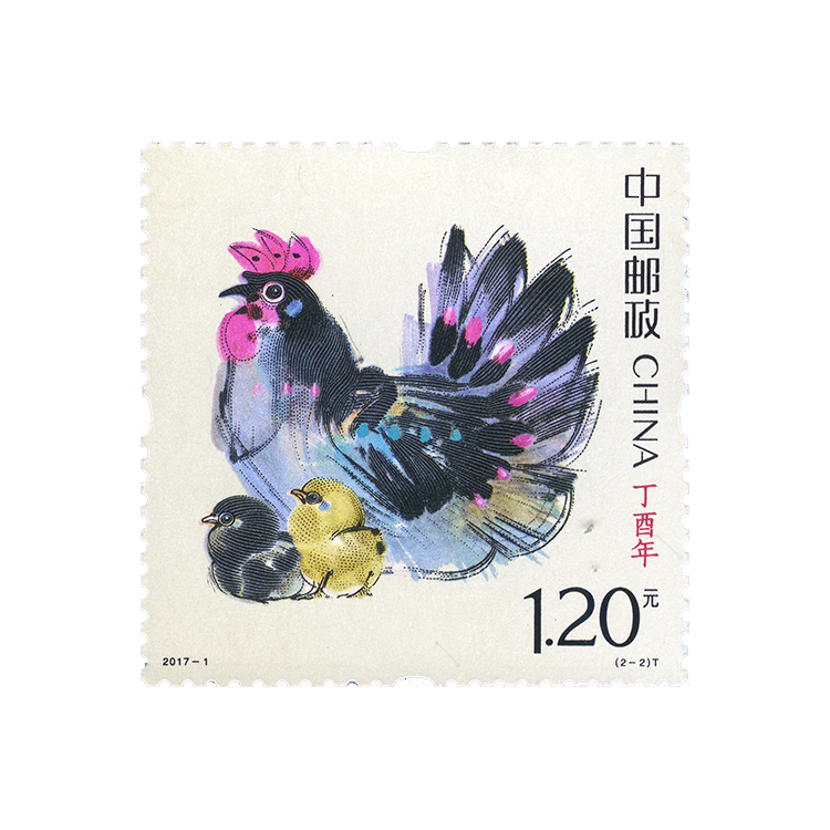 《丁酉年》生肖邮票将“国”和“家”的概念作为整套邮票的创作理念。邮票第一图画面表现一只奋进奔跑的公鸡形象,象征国家的快速发展,寓意“国”之概念;第二图画面内容表现母鸡带小鸡的场景,象征家庭幸福美满,寓意“家”之概念,全套邮票也蕴含着“合家欢”主题。同时,该套邮票色彩鲜明、线条流畅、形象传神、极具美感,整个设计将生肖鸡的形态神韵与深厚的家国情怀完美融合在一起,兼具艺术性与内涵性,堪称经典。