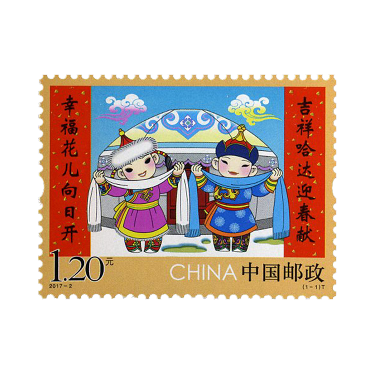 从2017年开始,《拜年》邮票将展开“民族大团结”的美丽画卷,围绕“欢欢喜喜过大年,民族团结一家亲”的主题展开。今年表现的是主体形象“欢欢”和“喜喜”身着蒙古族传统服饰,来到了美丽的大草原,手捧哈达,向全国各族人民拜年。蓝色的哈达象征着尊贵,白色的哈达象征着祝福,祥云象征着吉祥,蒙古包象征着幸福。“献哈达”是富有蒙古族新春特色的民俗活动,整个画面洋溢着“吉祥哈达迎春献,幸福花儿向日开”的喜庆氛围。