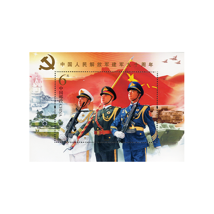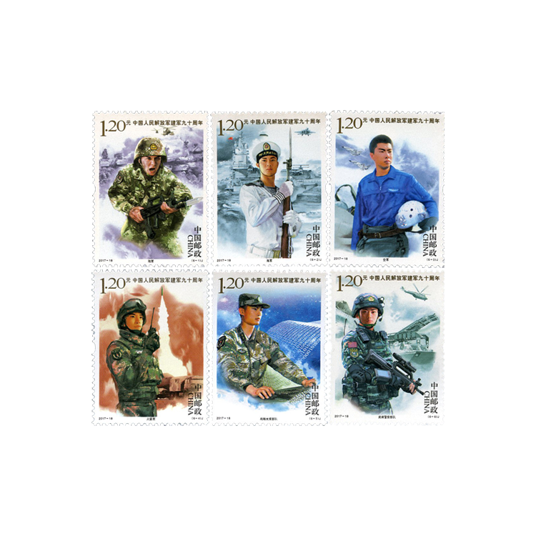 2017年8月1日中国邮政发行《中国人民解放军建军九十周年》纪念邮票,一套6枚,小型张1枚。