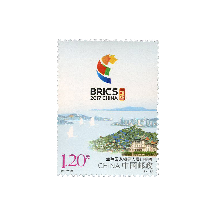 中国邮政定于2017 年8 月19 日发行《金砖国家领导人厦门会晤》纪念邮票1 套1 枚。