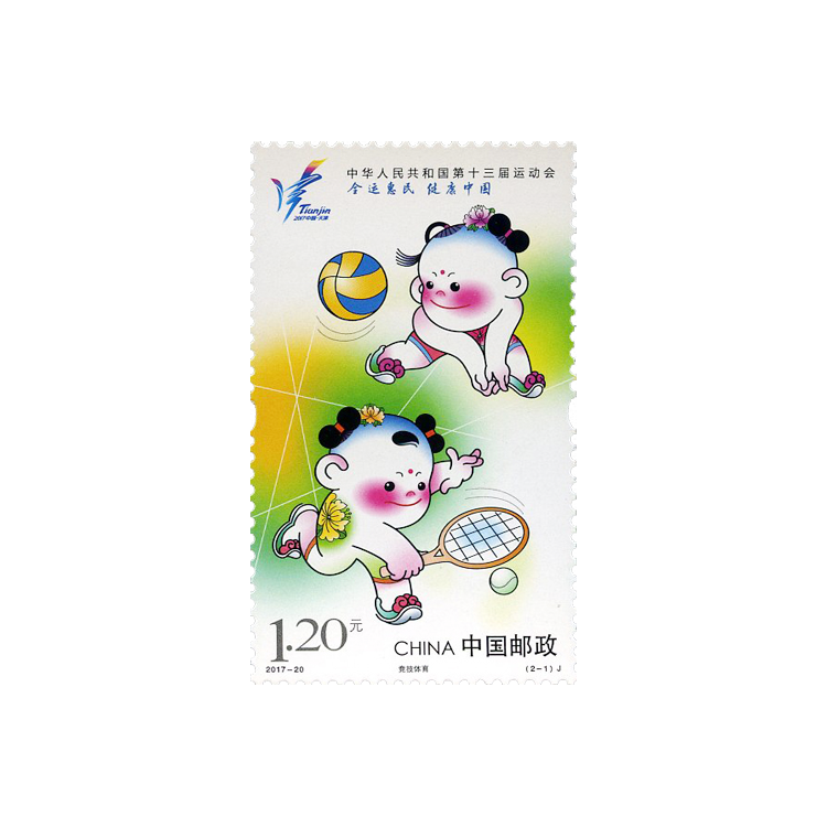 此次运动会的吉祥物“津娃”的设计造型来源于天津杨柳青木版年画。该套邮票以“津娃”为主体,突出了天津特色,“全运惠民 健康中国”的口号点出本届运动会的主题。邮票第一图竞技体育表现了竞技比赛中的网球、排球两项运动,展现了天津体育的传统强项;第二图表现了群众比赛中舞龙、柔力球两项运动,展现了本届运动会高度重视群众体育的突出特点。