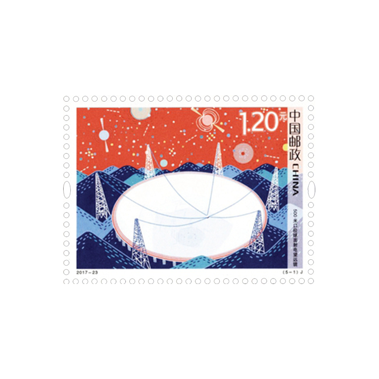 第一枚500米口径球面射电望远镜,画面以望远镜的主体结构为表现元素,描绘了主动反射面技术、轻型索拖动馈源支撑技术和利用天然地貌建设巨型望远镜的三大自主技术创新点。邮票背景通过表现中性氢、脉冲星、空间天体等科学符号,展现了望远镜作为多学科基础研究平台的强大功能。在紫外光下观察,模拟了射电望远镜从天空接收信号,再从射电望远镜镜面反射到馈源的科学原理。