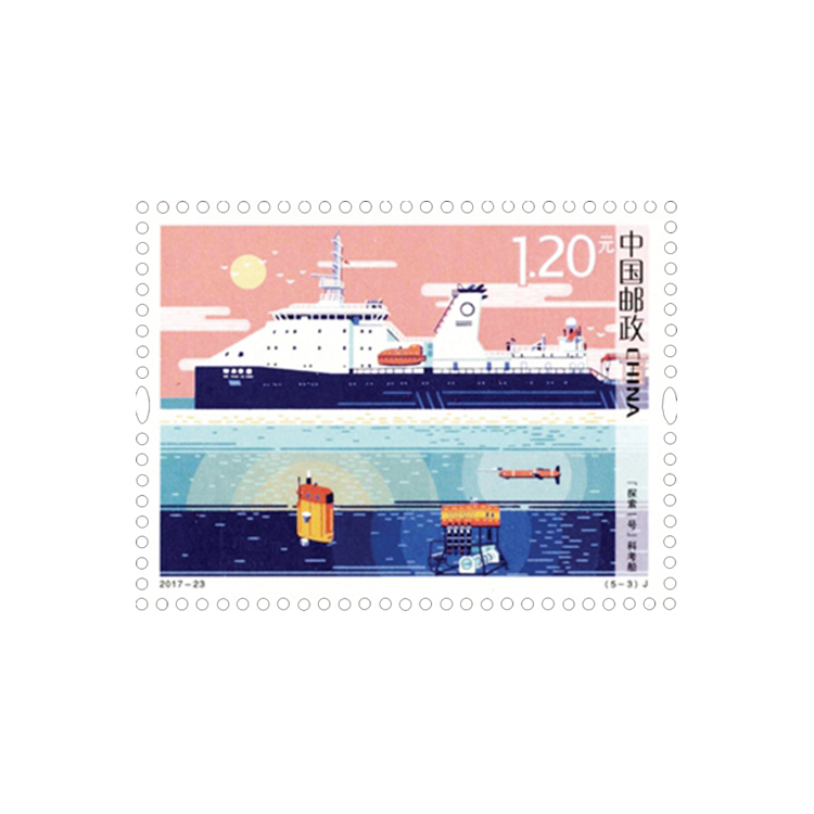 第三枚“探索一号”科考船,画面以4500米载人潜水器工作母船及深海科考通用平台——“探索一号”为画面主体,除此以外画面中还表现了其搭载的“海斗”号无人潜水器、“天涯”号着陆器、“海翼”号水下滑翔机的形象。紫外光下,表现了“海斗”号无人潜水器、“天涯”号着陆器和“海翼”号水下滑翔机在海底最大的下潜深度。