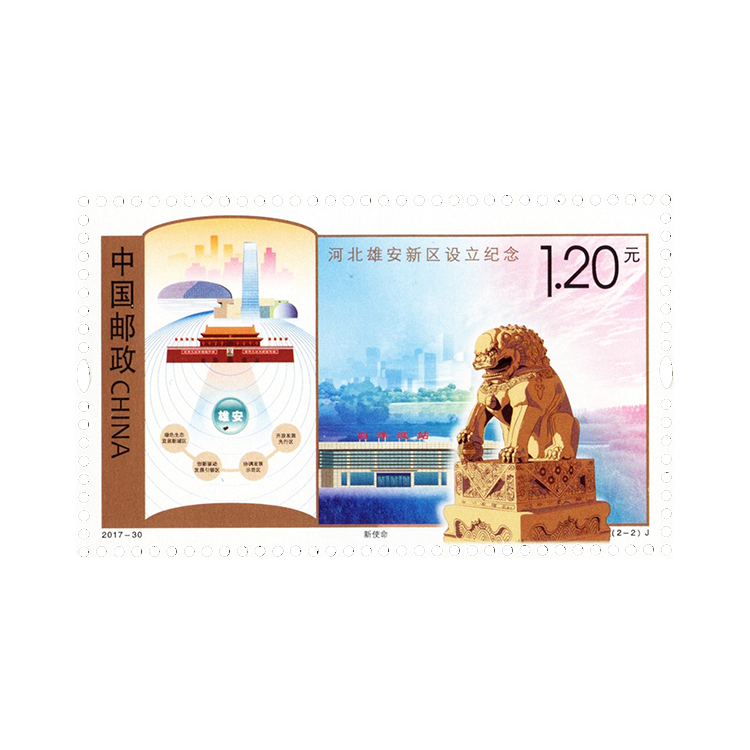 第二图新使命,卷首选取北京天安门等代表首都功能的建筑元素和雄安新区发展要求的文字元素,卷内则选取新华门前的石狮、白洋淀高铁客站、未来雄安新区建设展望等形象元素,体现了雄安新区作为疏解北京非首都功能集中承载地的功能定位和在京津冀协同发展战略中的历史使命,昭示着在以习近平同志为核心的党中央坚强领导下,雄安新区发展的美好前景。
