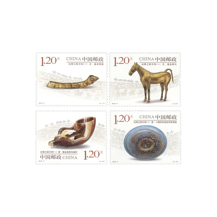 • 中国邮政定于2018年5月19日发行《丝绸之路文物(一)》特种邮票,一套4枚。