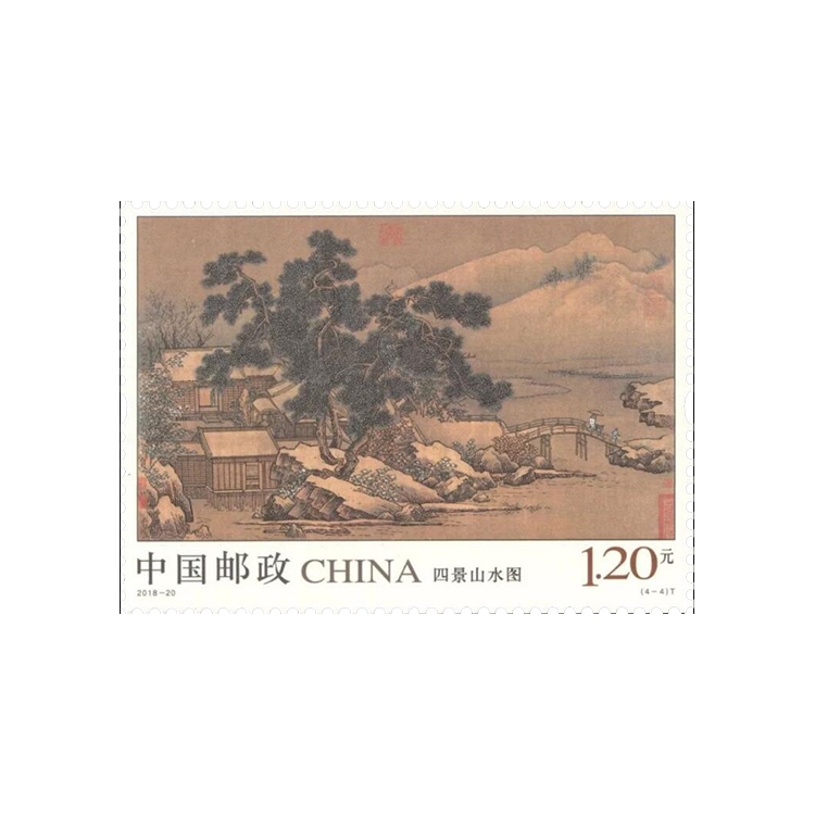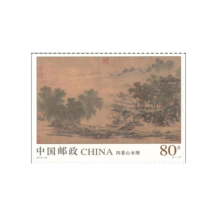 中国邮政定于2018年8月4日发行《四景山水图》特种邮票1套4枚,小全张1枚。