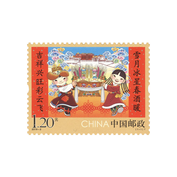 该套邮票是《拜年》系列的第五套。邮票主图为“欢欢”、“喜喜”,背景衬以位于西藏拉萨的布达拉宫。“欢欢”和“喜喜”身着藏族传统服饰,手捧象征吉祥的切玛,在藏民族聚居区向全国各族人民拜年。画面两侧楹联文字为“雪月冰星春酒暖 吉祥兴旺彩云飞”。整个画面轻松愉悦,洋溢着新年的喜庆气氛。