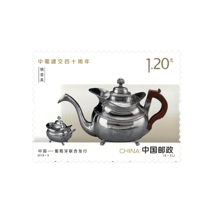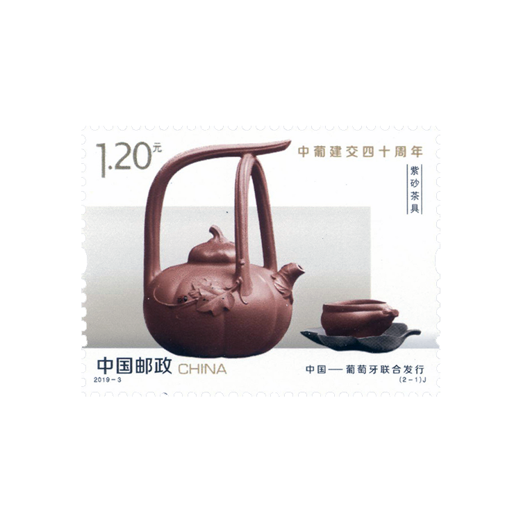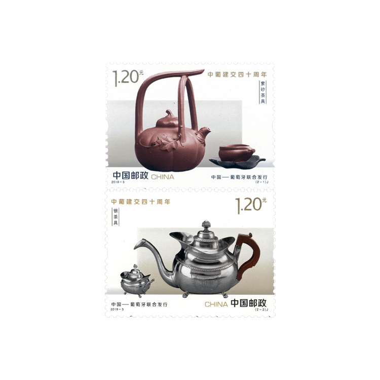 此次中葡联合发行邮票展现了具有两国特色的茶具。邮票第一图选取中国的紫砂茶具,画面以紫砂壶为主体,一旁为紫砂茶杯。以紫砂壶为代表的紫砂茶具是江苏宜兴特有的陶土工艺品。邮票上的紫砂壶器型优美,以南瓜型的壶体和瓜藤型的提梁而富有自然情趣,现藏于宜兴市阳羡紫砂陶博物馆,其制作者是第一批国家级非物质文化遗产“宜兴紫砂制作技艺”代表性传承人汪寅仙。邮票第二图选取葡萄牙的银茶具,画面以银茶壶为主体,一旁为银质糖罐。邮票上的银茶壶器型精美,壶身上有装饰纹样,底部有圆形四足,配木制手柄,于19世纪早期出产于葡萄牙港口城市波尔图,现藏于葡萄牙拉梅古博物馆。