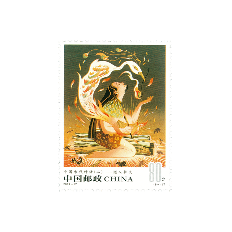 中国邮政定于2019年8月6日发行《中国古代神话(二)》特种邮票1套6枚,邮票图案名称分别为:燧人取火、伏羲画卦、神农尝百草、嫘祖始蚕、仓颉造字、大禹治水。全套邮票面值为6.40元。