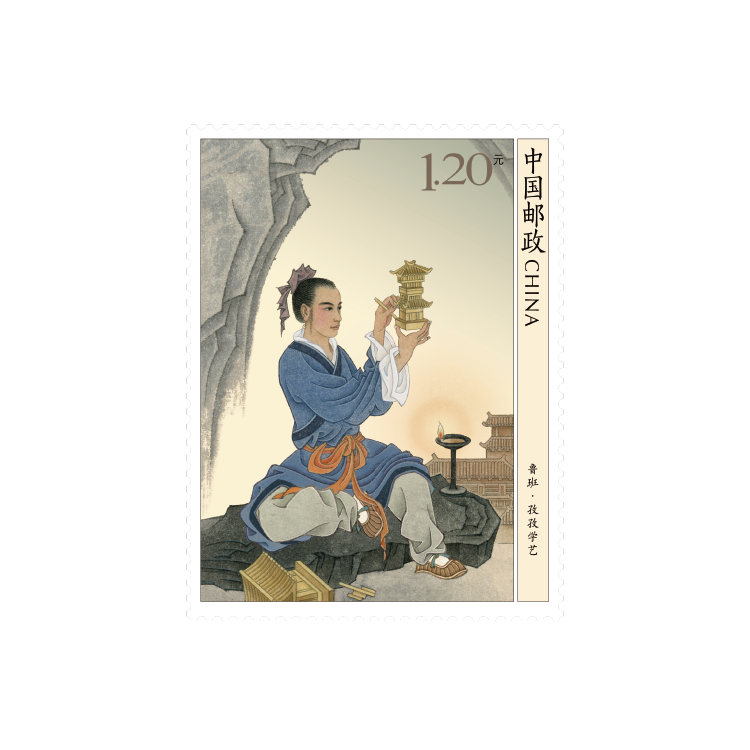 该套邮票采用工笔重彩的创作手法,画面构图饱满、敷色浓淡相宜、细节处理严谨细腻。第一图孜孜学艺,描绘了鲁班年轻时访得名师后,在山洞中专心研习的场景;第二图砥志研思,描绘了鲁班凿刻大石发明石磨的场景。小型张为鲁班像,描绘了鲁班手持墨斗,神情坚毅、目光炯炯,这是千万工匠不断钻研、追求极致的真实写照,也是“工匠精神”的生动体现。