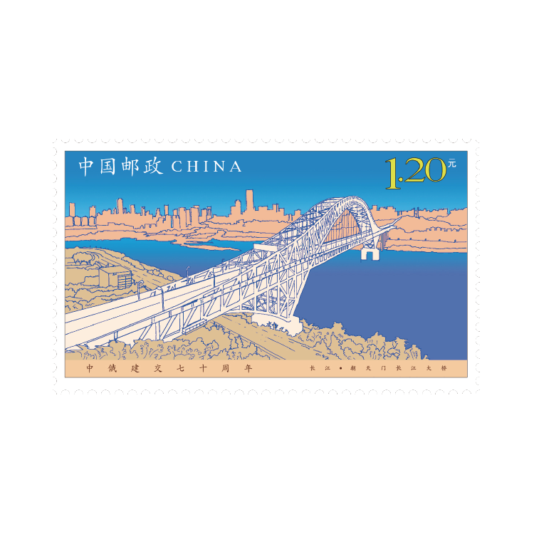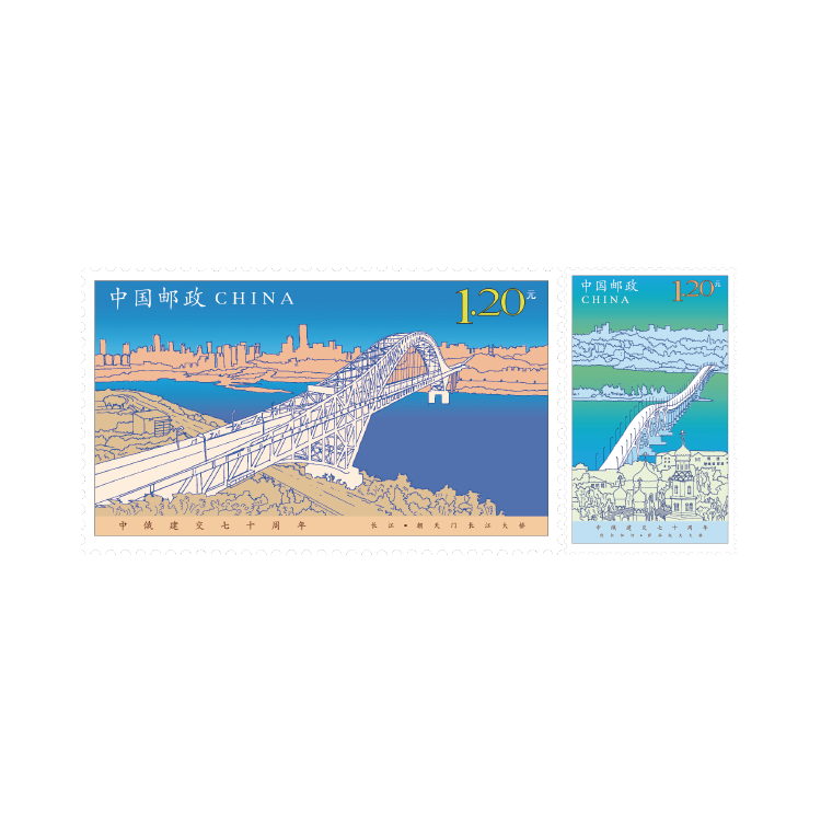 今年是中华人民共和国与俄罗斯联邦建交70周年,中国邮政定于2019年10月2日发行《中俄建交七十周年》纪念邮票1套2枚,邮票图案名称分别为:长江·朝天门长江大桥 、 伏尔加河·萨拉托夫大桥,全套邮票面值为2.40元。