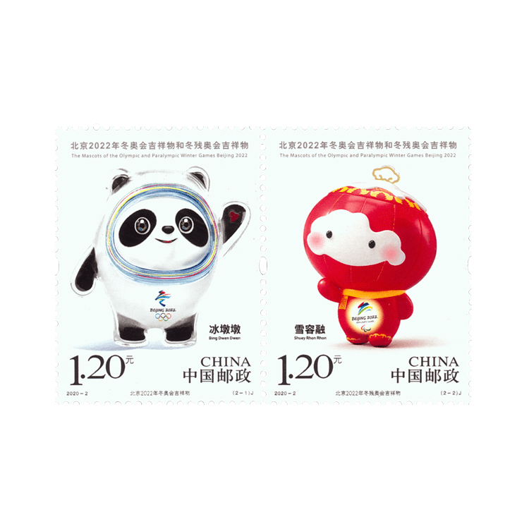 中国邮政定于2020年1月16日发行《北京2022年冬奥会吉祥物和冬残奥会吉祥物》纪念邮票1套2枚,邮票图案名称分别为:北京2022年冬奥会吉祥物、北京2022年冬残奥会吉祥物。全套邮票面值为2.40元。