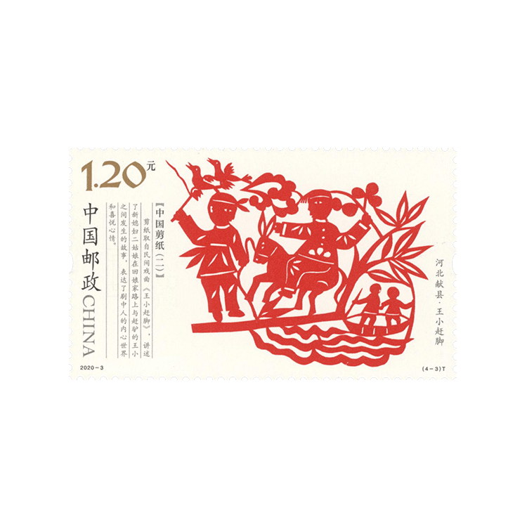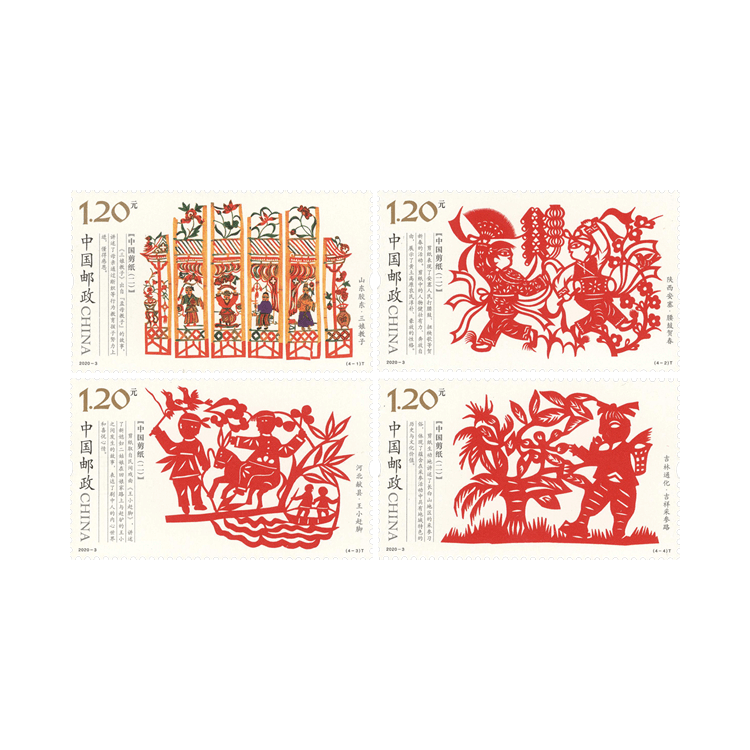 中国邮政定于2020年2月8日发行《中国剪纸(二)》特种邮票1套4枚,全套邮票面值为4.80元。