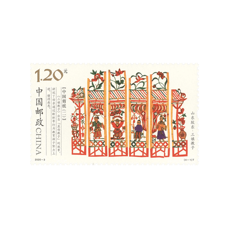 该套邮票为《中国剪纸》系列邮票的第二组。第一图“山东胶东·三娘教子”,《三娘教子》出自“孟母教子”的故事,讲述了母亲通过断织等行为教育孩子努力上进,懂得感恩。第二图“陕西安塞·腰鼓贺春”,剪纸表现了安塞人民打腰鼓、扭秧歌等贺新春的活动。剪纸中的人物健壮有力、奔放自由,展示了黄土高原农民淳朴、豪放的性格。第三图“河北献县·王小赶脚”,剪纸取自民间戏曲《王小赶脚》,讲述了新媳妇二姑娘在回娘家路上与赶驴的王小之间发生的故事,表达了剧中人的内心世界和喜悦心情。第四图“吉林通化·吉祥采参路”,剪纸生动地讲述了长白山地区的采参习俗,体现了蕴含在采参活动中具有地域特色的历史与文化价值。