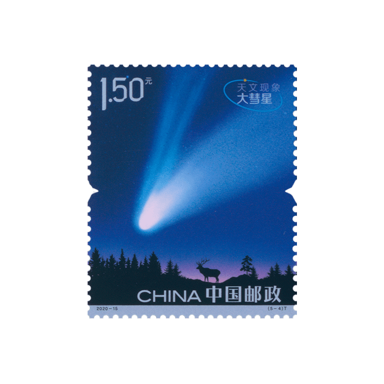 彗星和行星一样,是围绕着太阳公转的天体。彗星之所以长着尾巴,是其表面有高度活性的物质被释放出来。彗星的彗核是水、冰和尘埃等活性物质和岩石结合而成,活性物质在太阳热量的作用下挥发,形成非常稀薄的大气,即彗发。邮票第四枚“大彗星”,中国古代又称“扫把星”,意为大彗星降落形态似扫把。图中的彗星有彗核、彗发和彗尾。